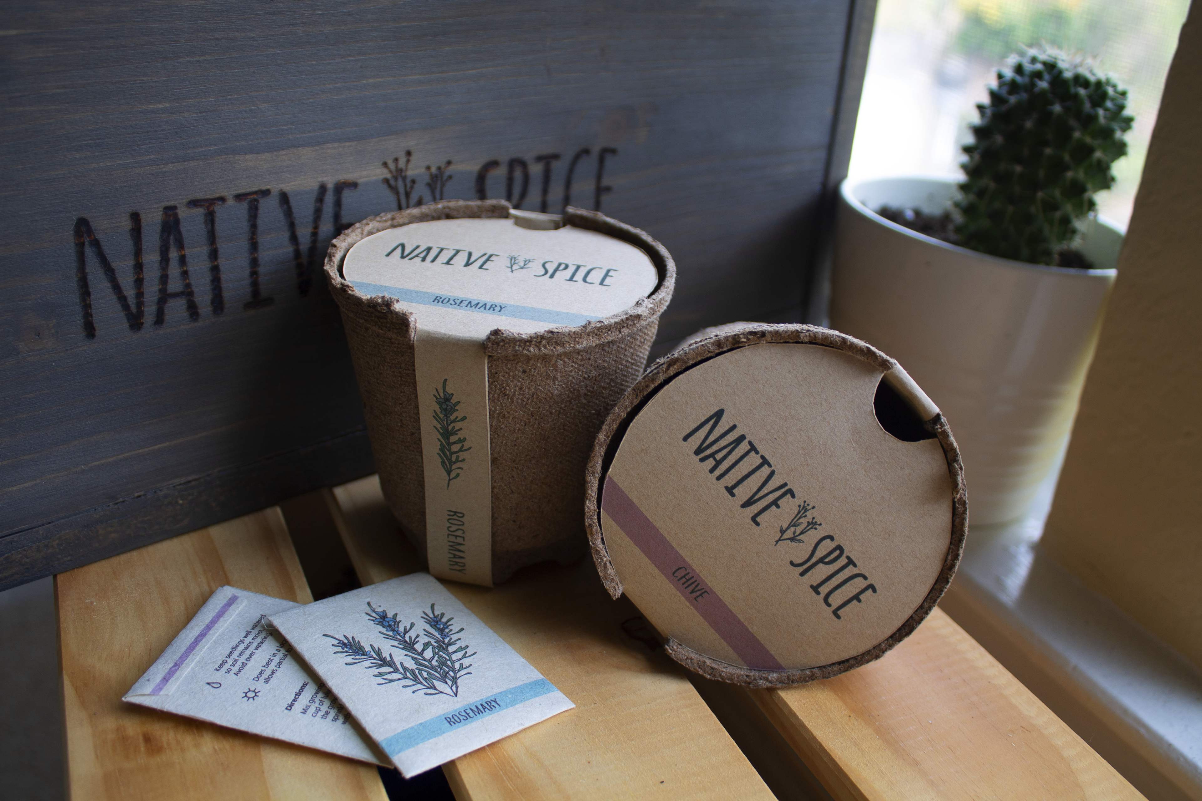 Native Spice is an all inclusive planting kit that focuses on earth friendly materials. Packaging includes seed embedded paper, biodegradable planters, peat pellets, and recycled cardstock.